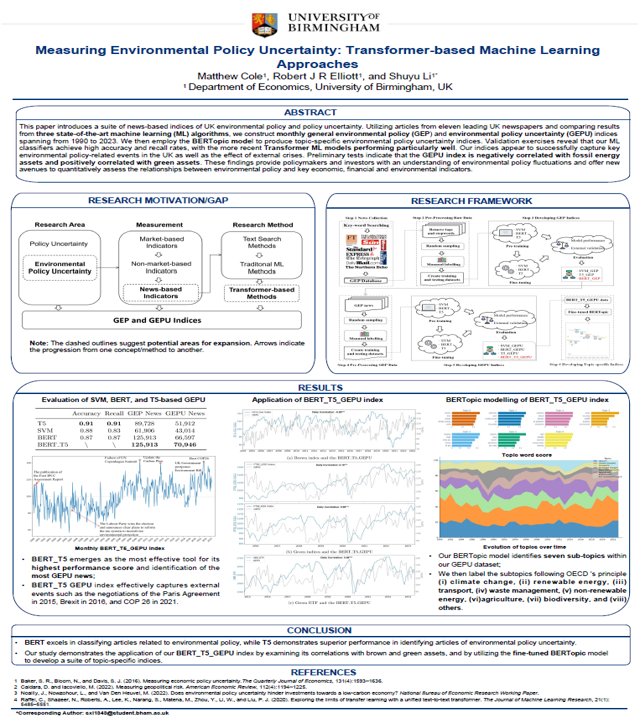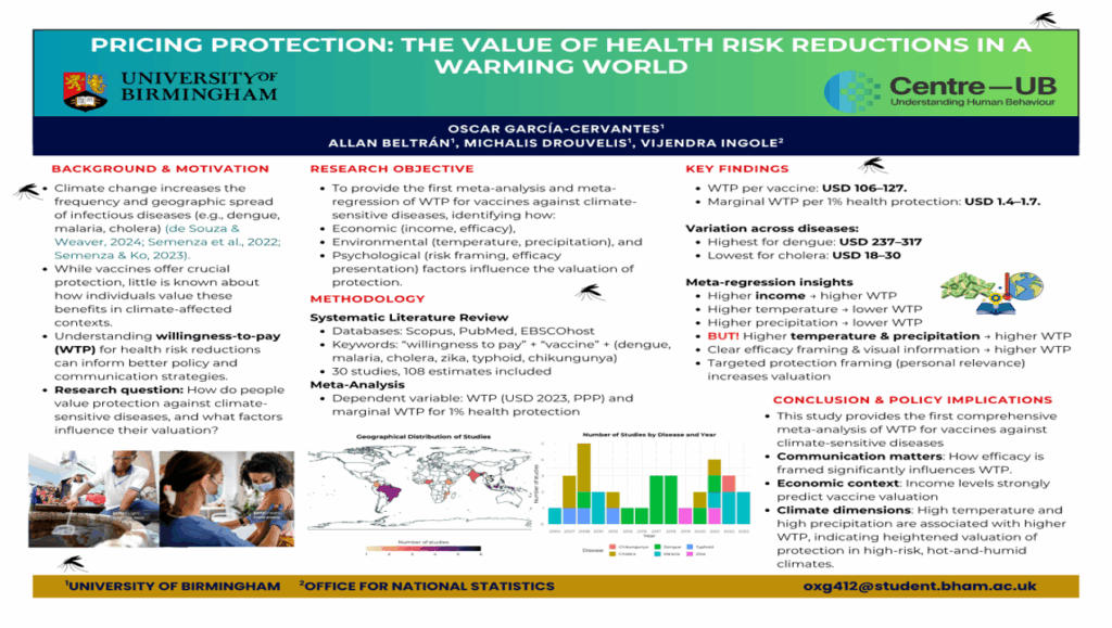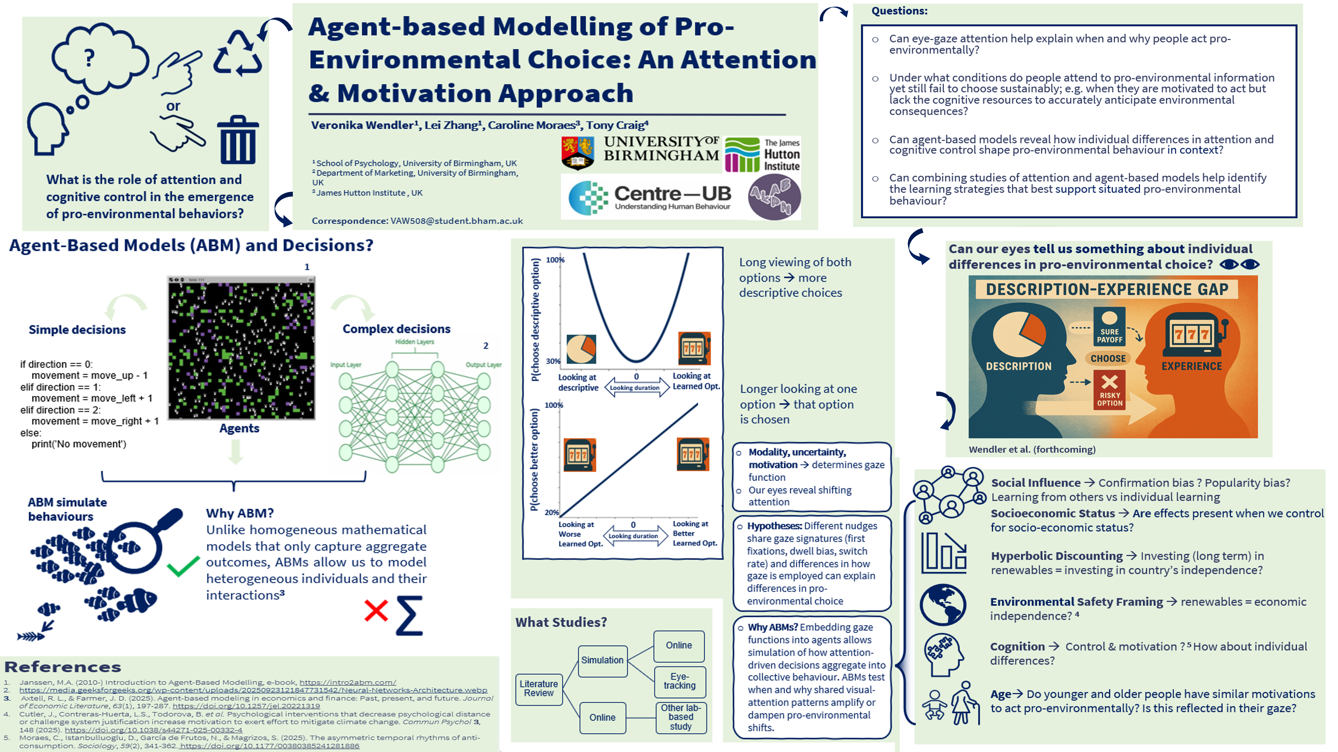 Our PhD students, Oscar, Sanoji, Veronika and Andrea also contributed posters to the event which you can see below. These included presentations on “Pricing Protection: The value of health risk reductions in a warming world”, “Influencers of users’ attitudinal and behavioural patterns in urban shared travel environments”, “How zoo visitors perceive species’ conservation status”, “Agent-based modelling of pro-environmental choice: an attention and motivation approach”, Innovation to overcome barriers to biological protection”, “Links between climate change and criminality”, and “Measuring environmental policy uncertainty”.