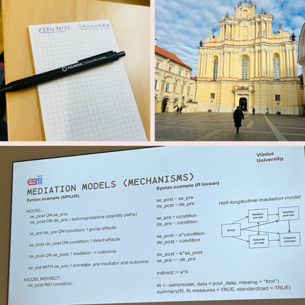Before the conference started, I took the opportunity to attend a pre-conference statistical analysis workshop. This was led by Dr. Inga Truskauskaite, Developmental Psychologist and Associate Professor at Vilnius University’s Psychology Institute. The workshop explored structural equation modelling (SEM) for evaluating the effects of digital mental health interventions. SEM is a statistical analysis technique that researchers can use to understand how different factors (e.g., our self-esteem and ability to control our emotions) might interact and contribute to the outcome(s) of a digital mental health intervention (e.g., that seeks to prevent depression) over time.